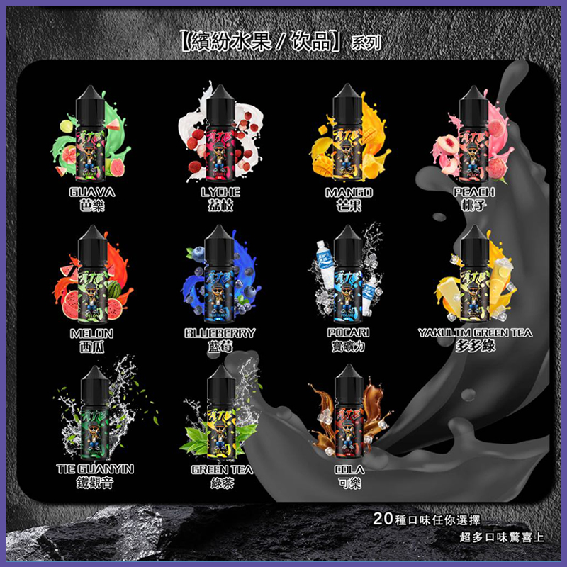 葡萄, 百香果, 多多綠, 荔枝, 芭樂, 薄荷, 可樂, 芒果, 西瓜, 藍莓, 綠茶, 水蜜桃, 鐵觀音, 寶礦力, 蘋果, 古巴煙草, 咖啡, 奇異果, 哈蜜瓜, 檸檬海監